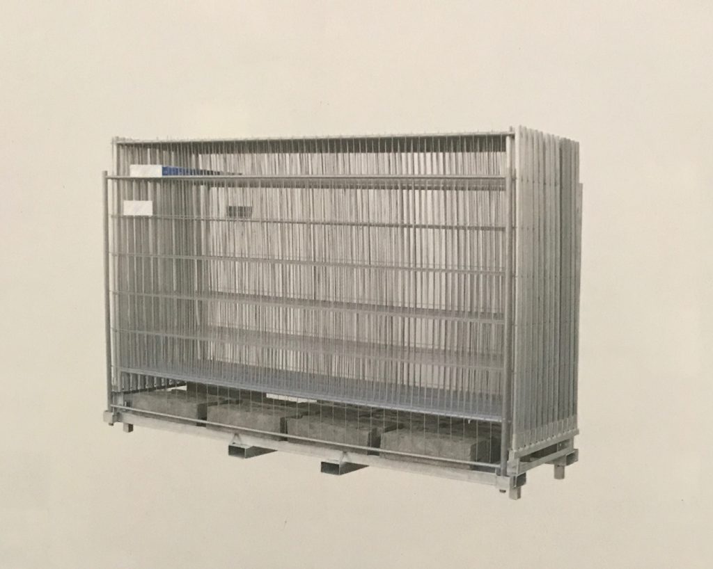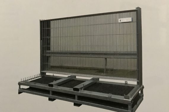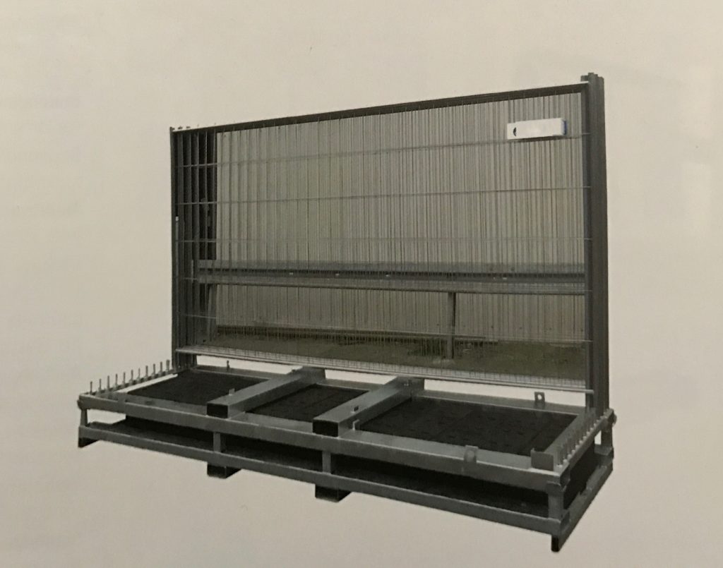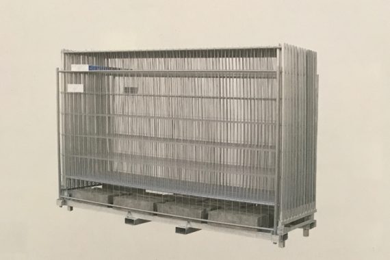 Für die Lagerund und den Transport von 25 Mobilzäunen und 26 Füßen. Die Füße sind durch das erste und letzte Zaunfeld, welches tiefer steht, gesichert.